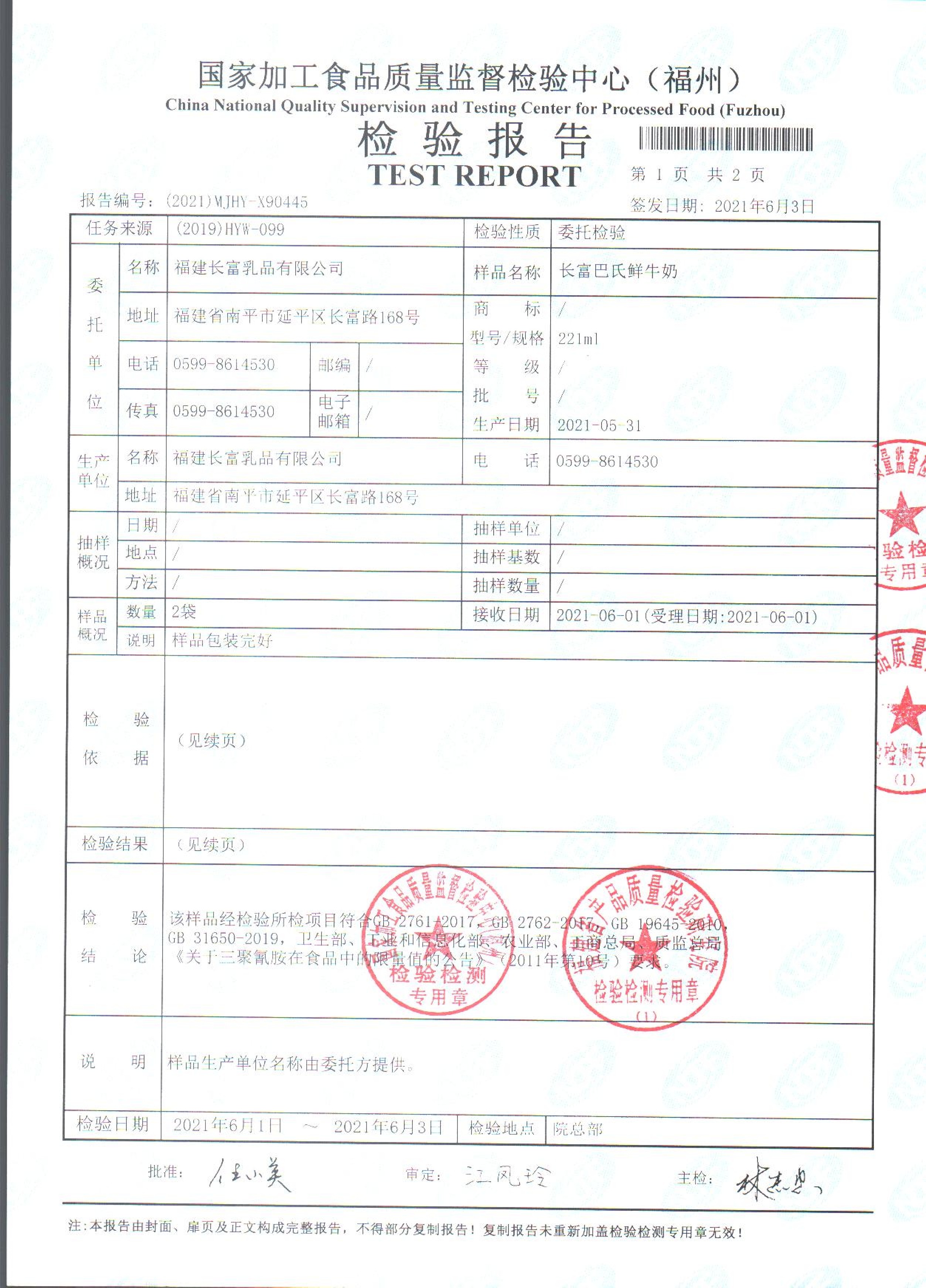長(zhǎng)富牛奶2021年6月1日質(zhì)檢所冷鏈檢測(cè)報(bào)告