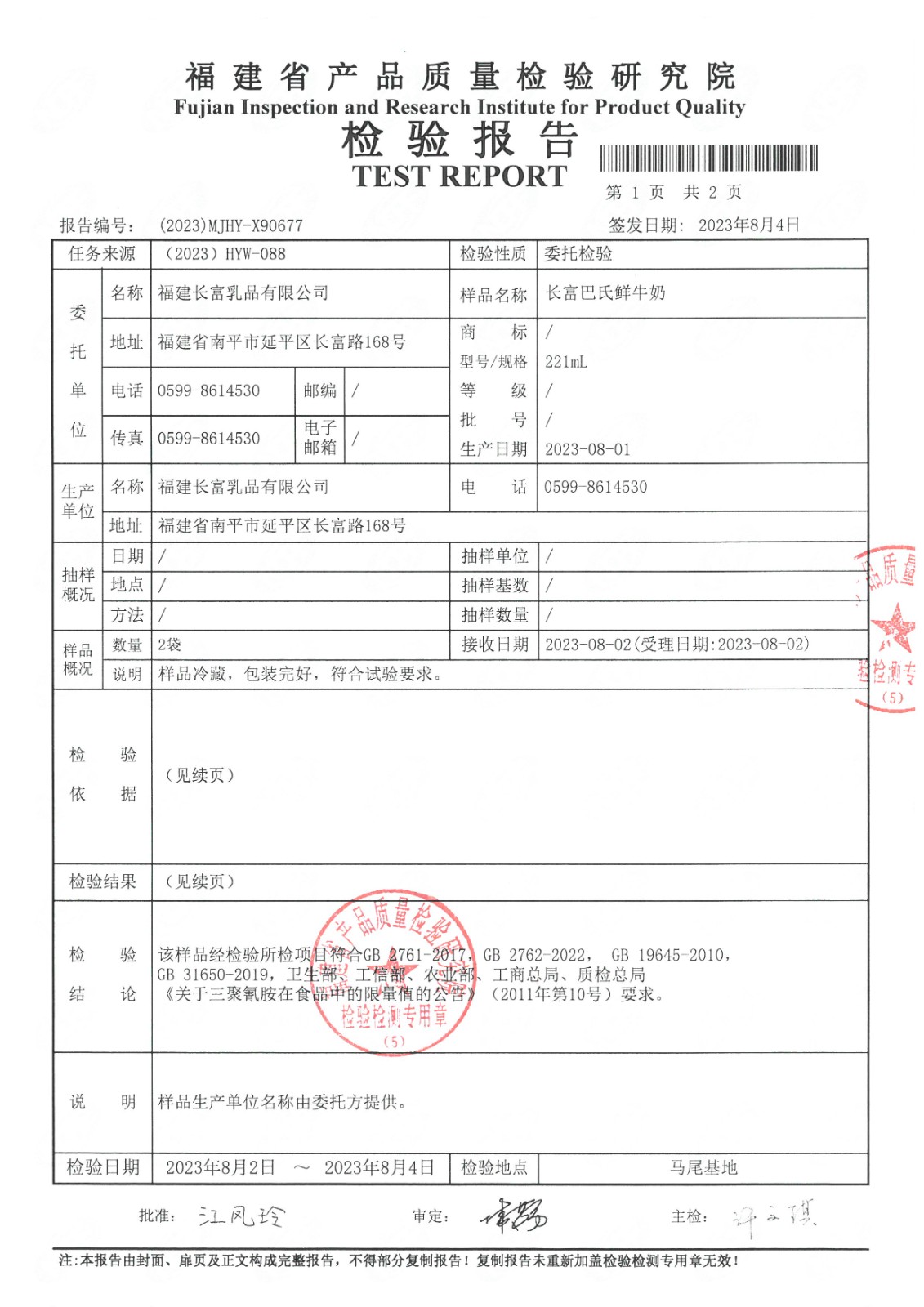 長富牛奶2023年8月1日省質檢院冷鏈檢測報告