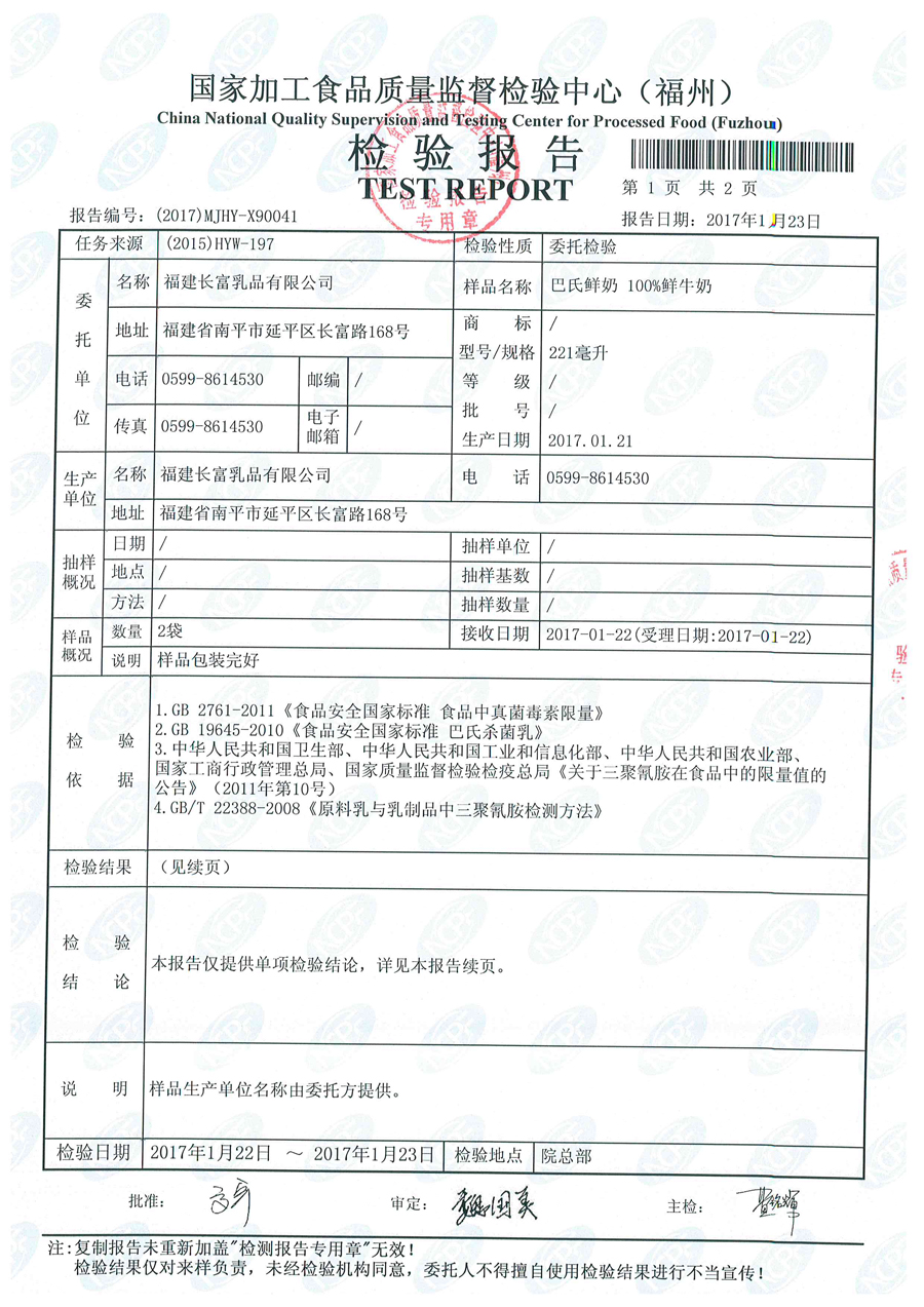 長(zhǎng)富牛奶2017年1月21日質(zhì)檢所冷鏈檢測(cè)報(bào)告