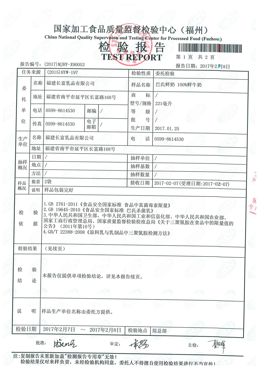 長富牛奶2017年1月25日質(zhì)檢所冷鏈檢測報(bào)告