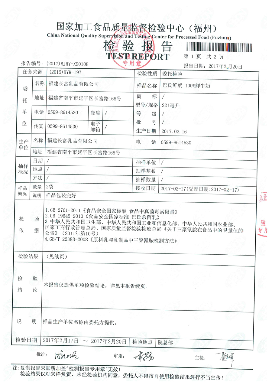 長富牛奶2017年2月16日質(zhì)檢所冷鏈檢測報(bào)告
