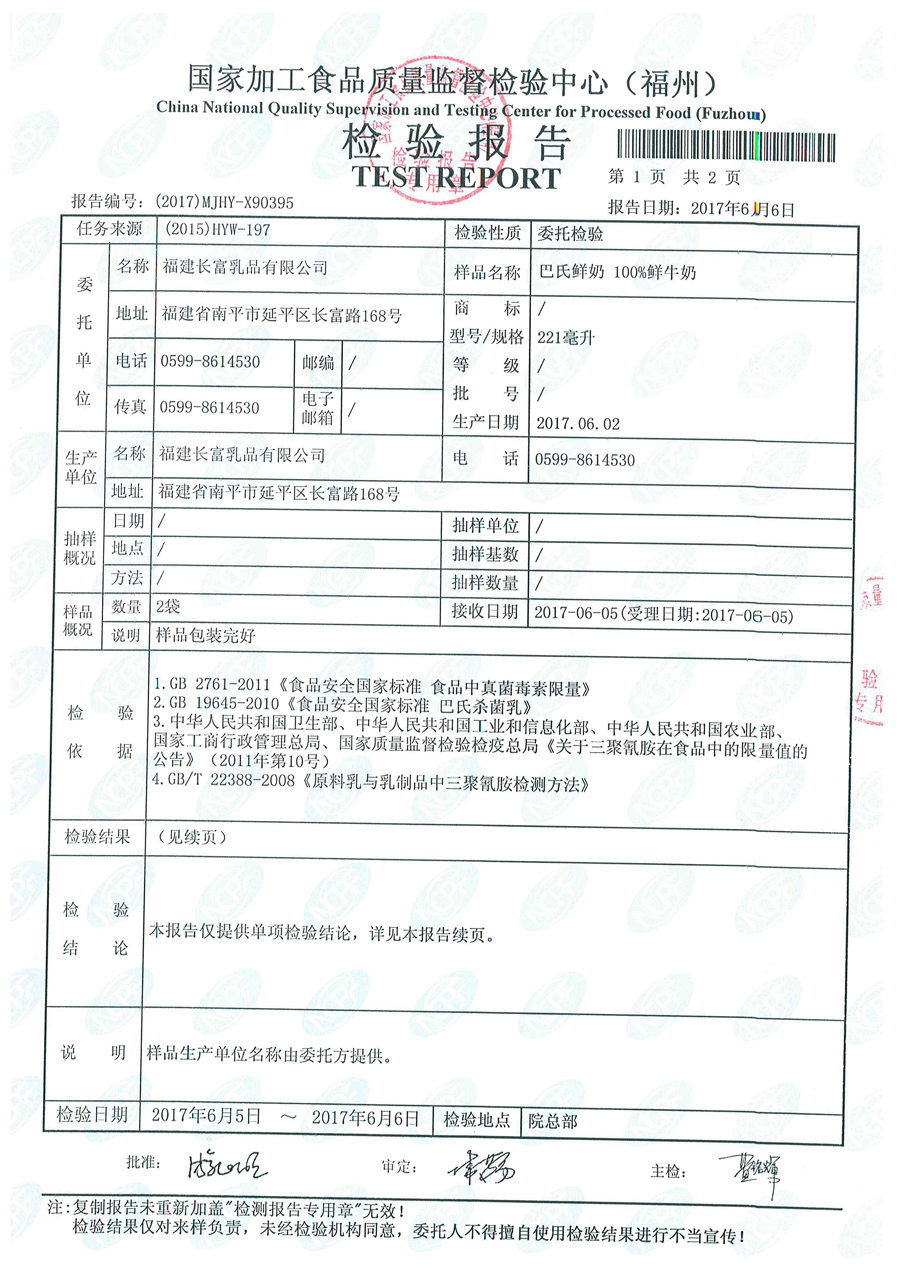 長富牛奶2017年6月1日質(zhì)檢所冷鏈檢測報告