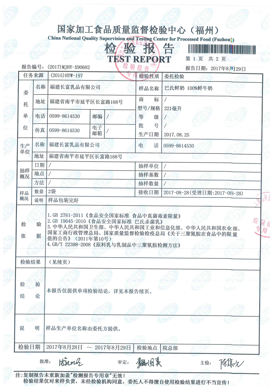 長富牛奶2017年8月25日質檢所冷鏈檢測報告