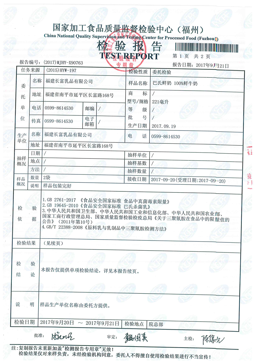 長富牛奶2017年9月19日質檢所冷鏈檢測報告