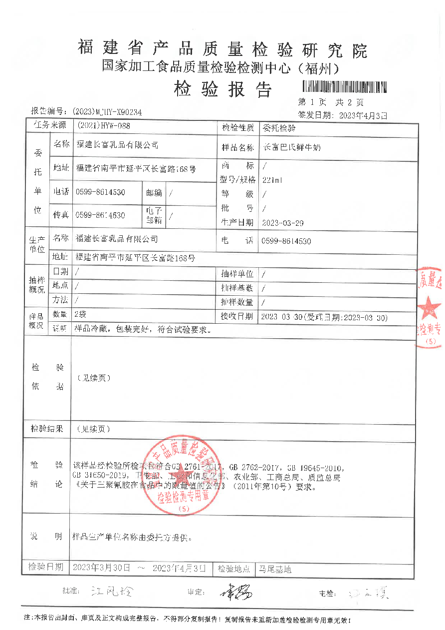 長富牛奶2023年3月29日省質檢院冷鏈檢測報告