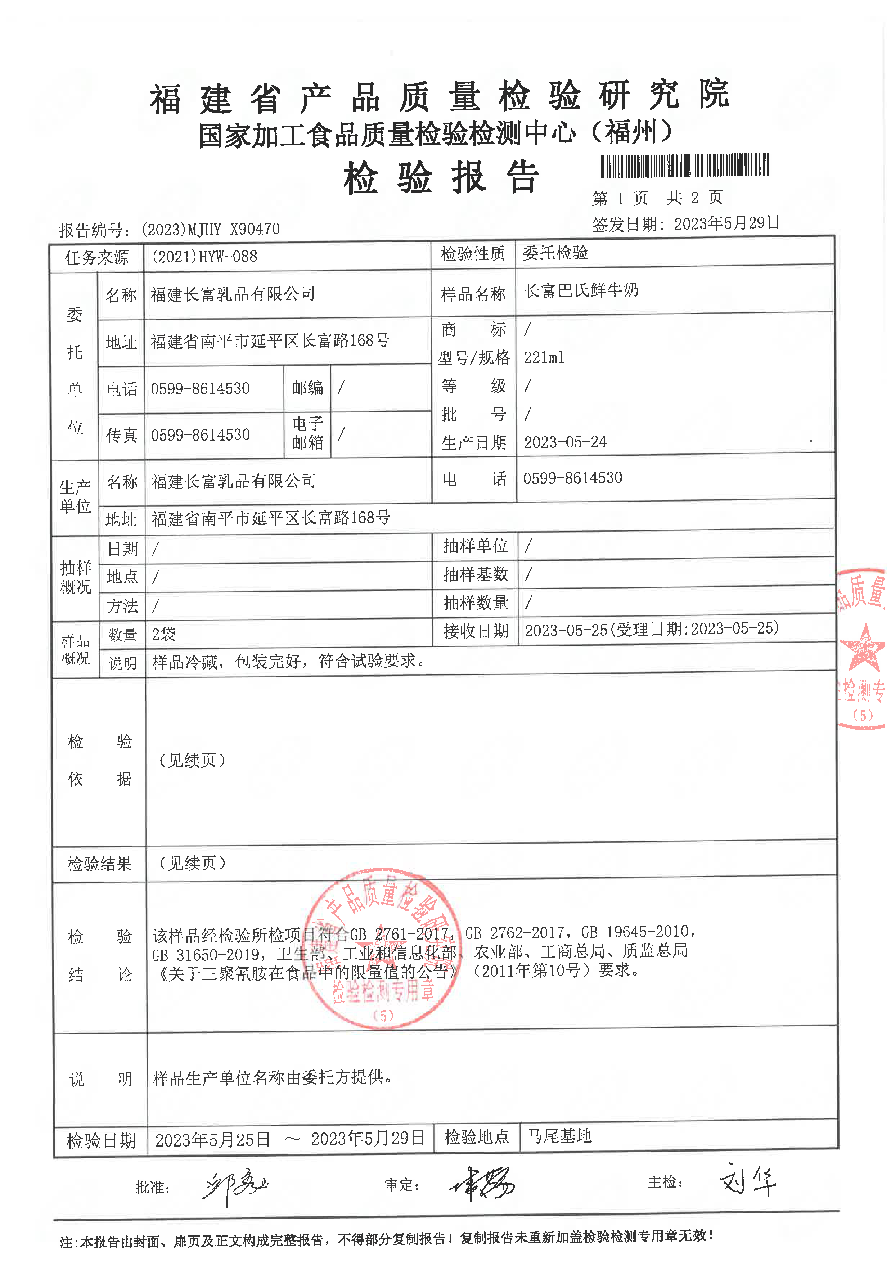 長富牛奶2023年5月24日省質檢院冷鏈檢測報告