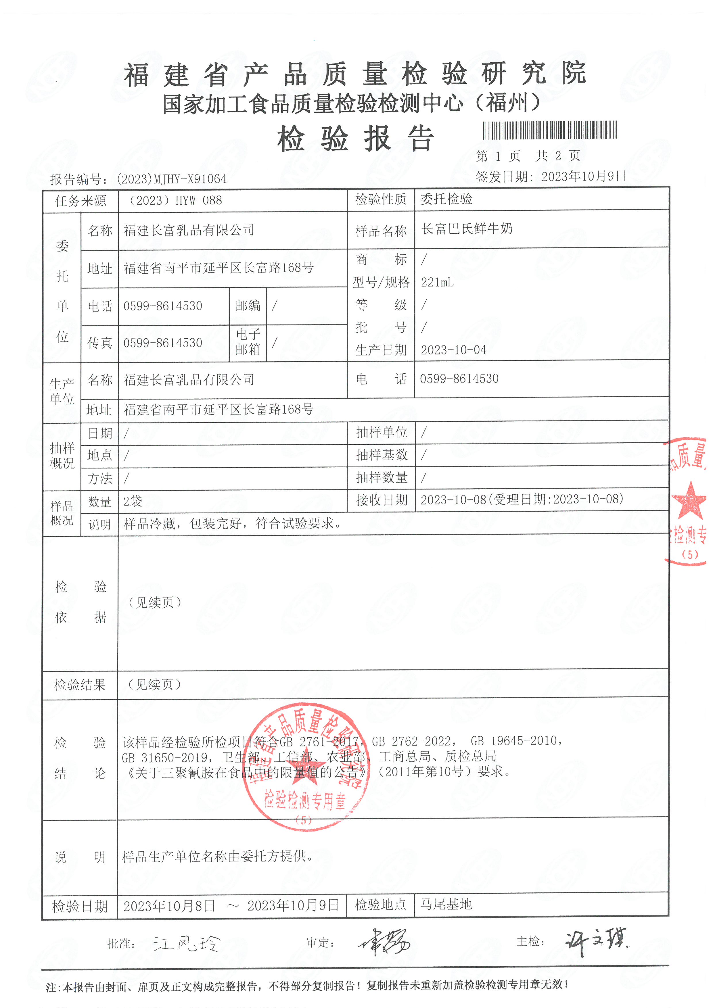 長富牛奶2023年9月1日省質檢院冷鏈檢測報告