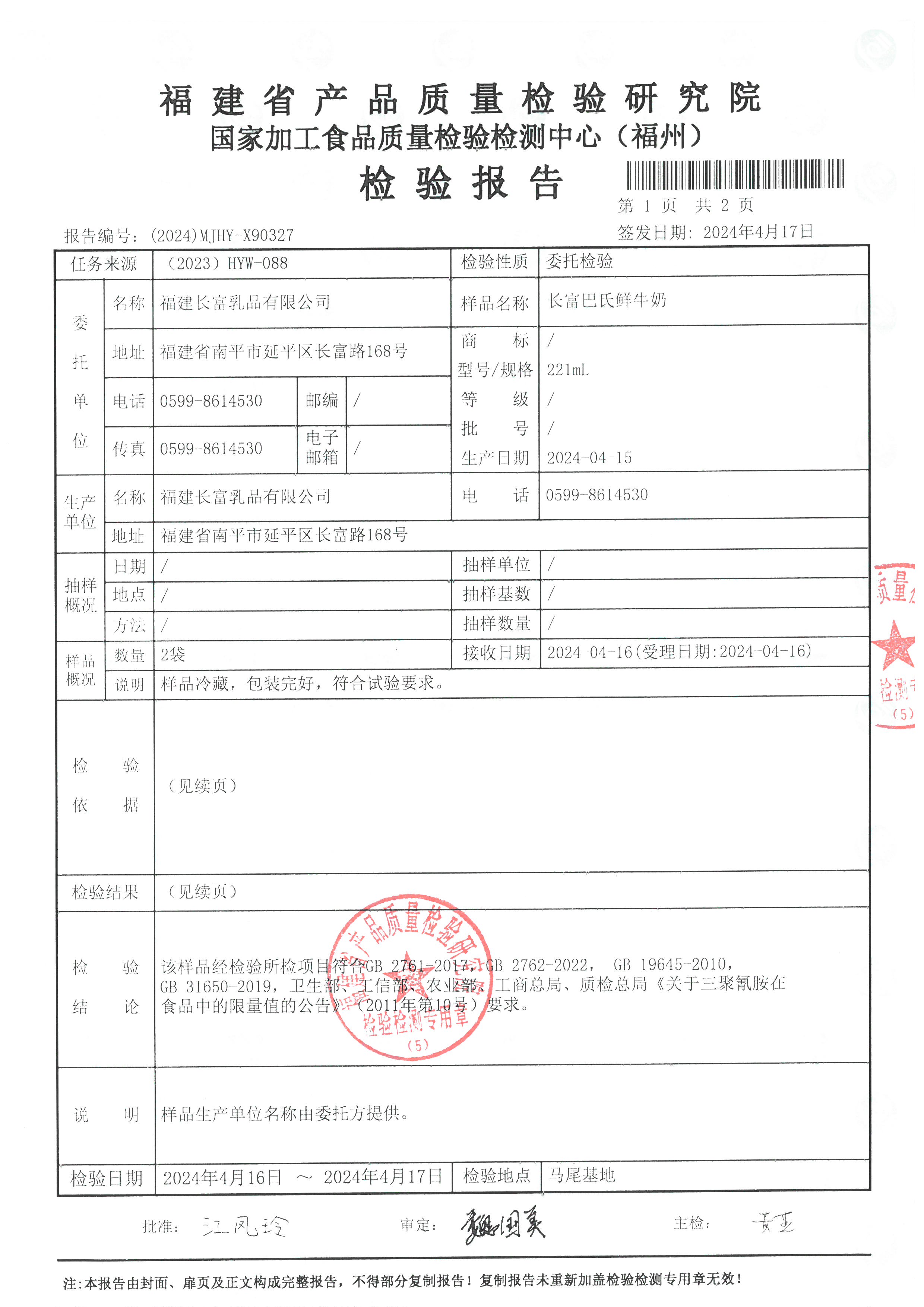 長富牛奶2024年4月15日省質檢院冷鏈檢測報告
