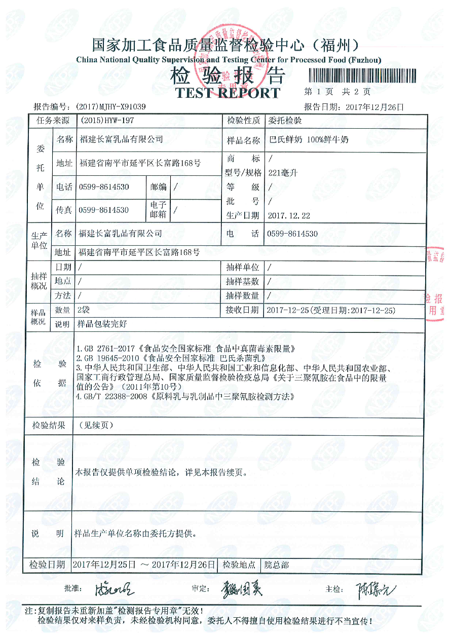 長富牛奶2017年12月26日質檢所冷鏈檢測報告