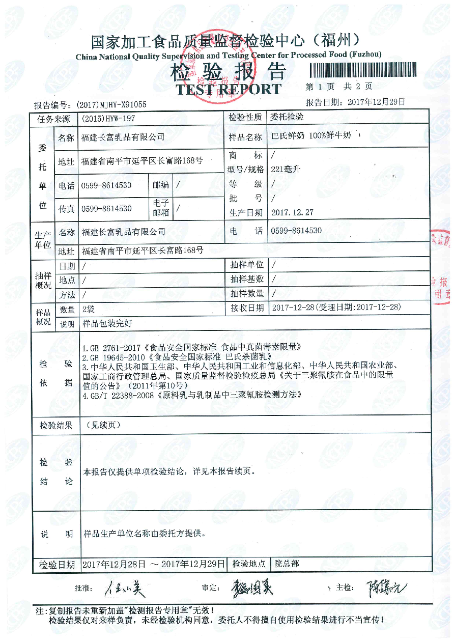 長富牛奶2017年12月28日質檢所冷鏈檢測報告