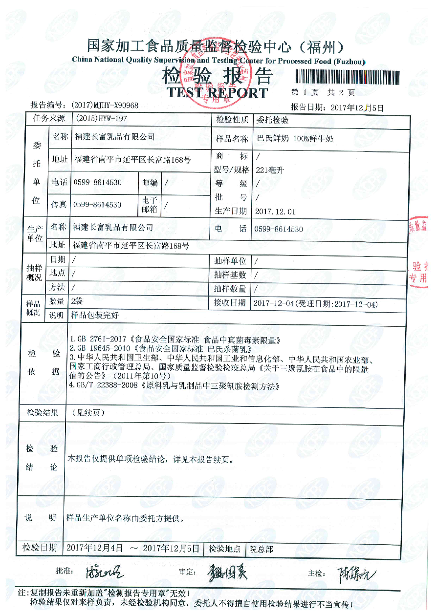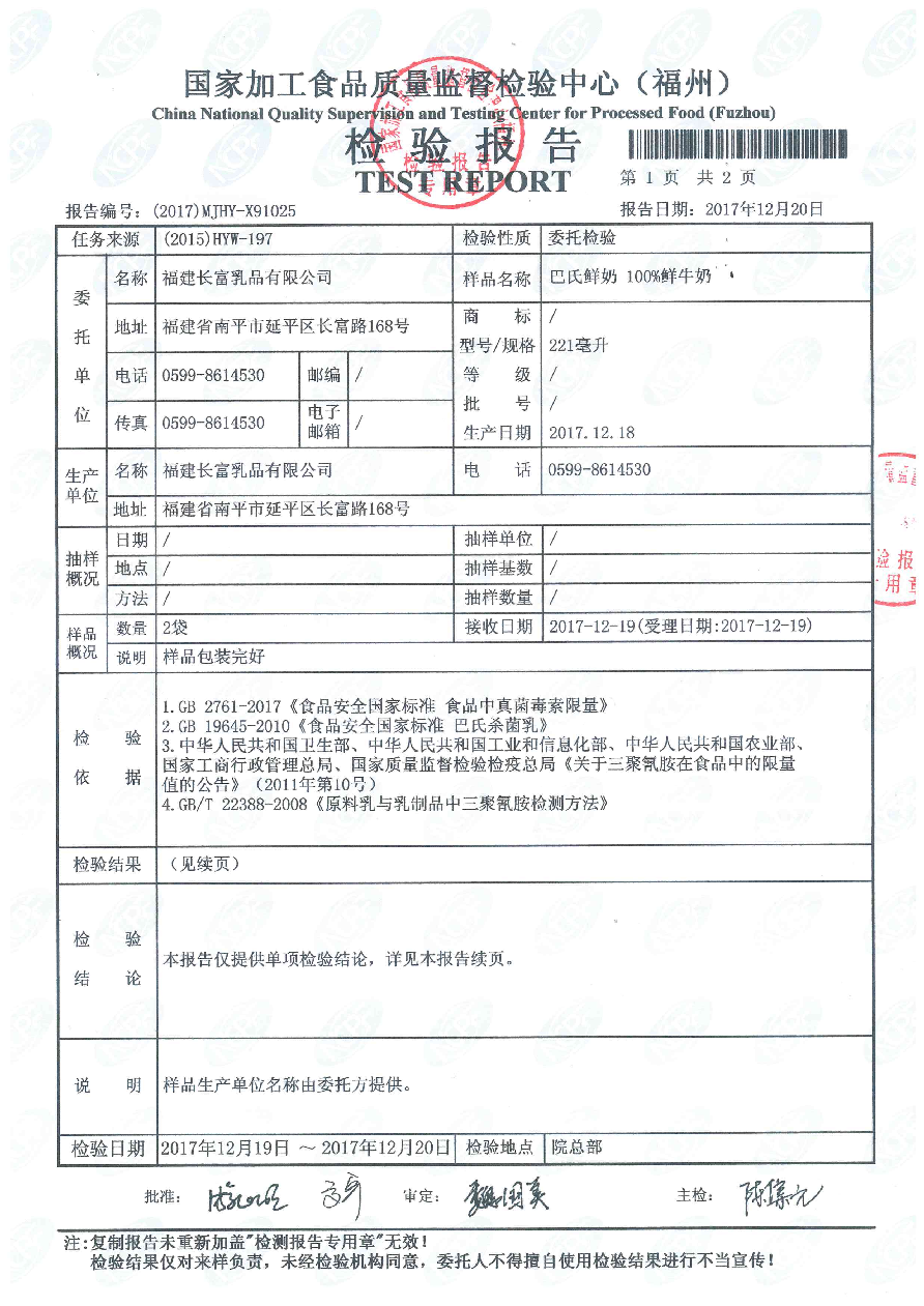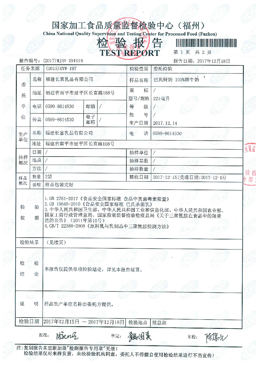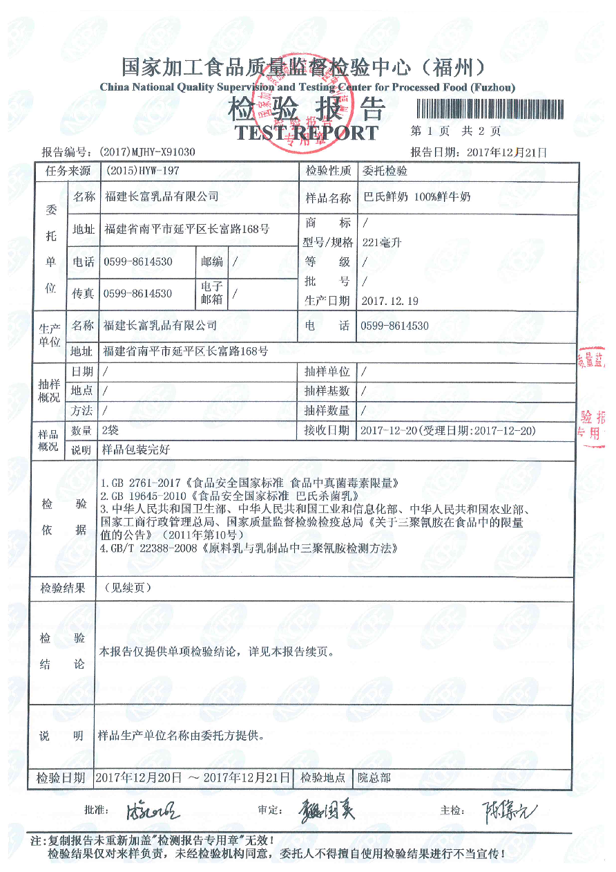 長富牛奶2017年12月15日質檢所冷鏈檢測報告