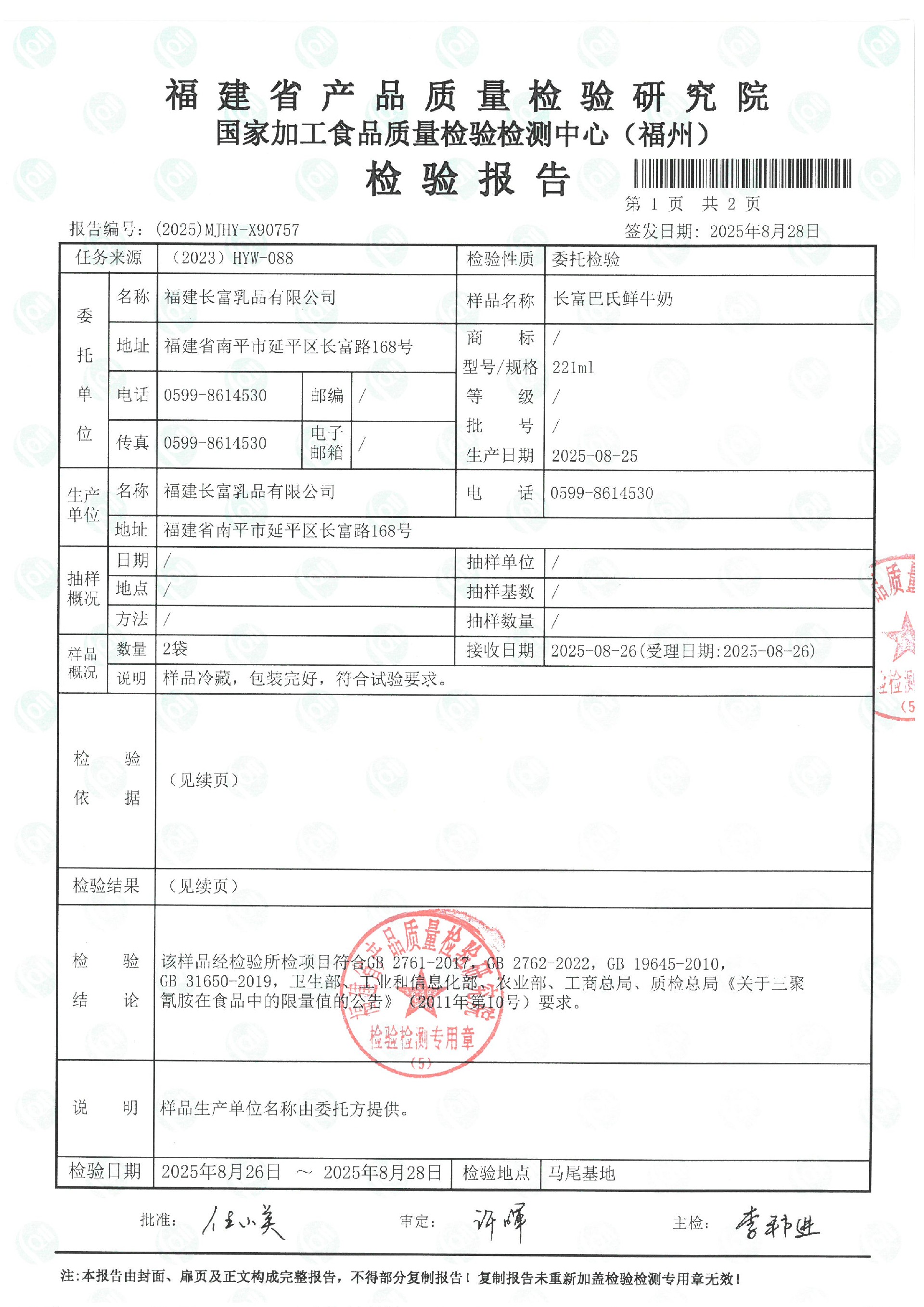 長富牛奶2025年8月27日省質(zhì)檢院冷鏈檢測報(bào)告