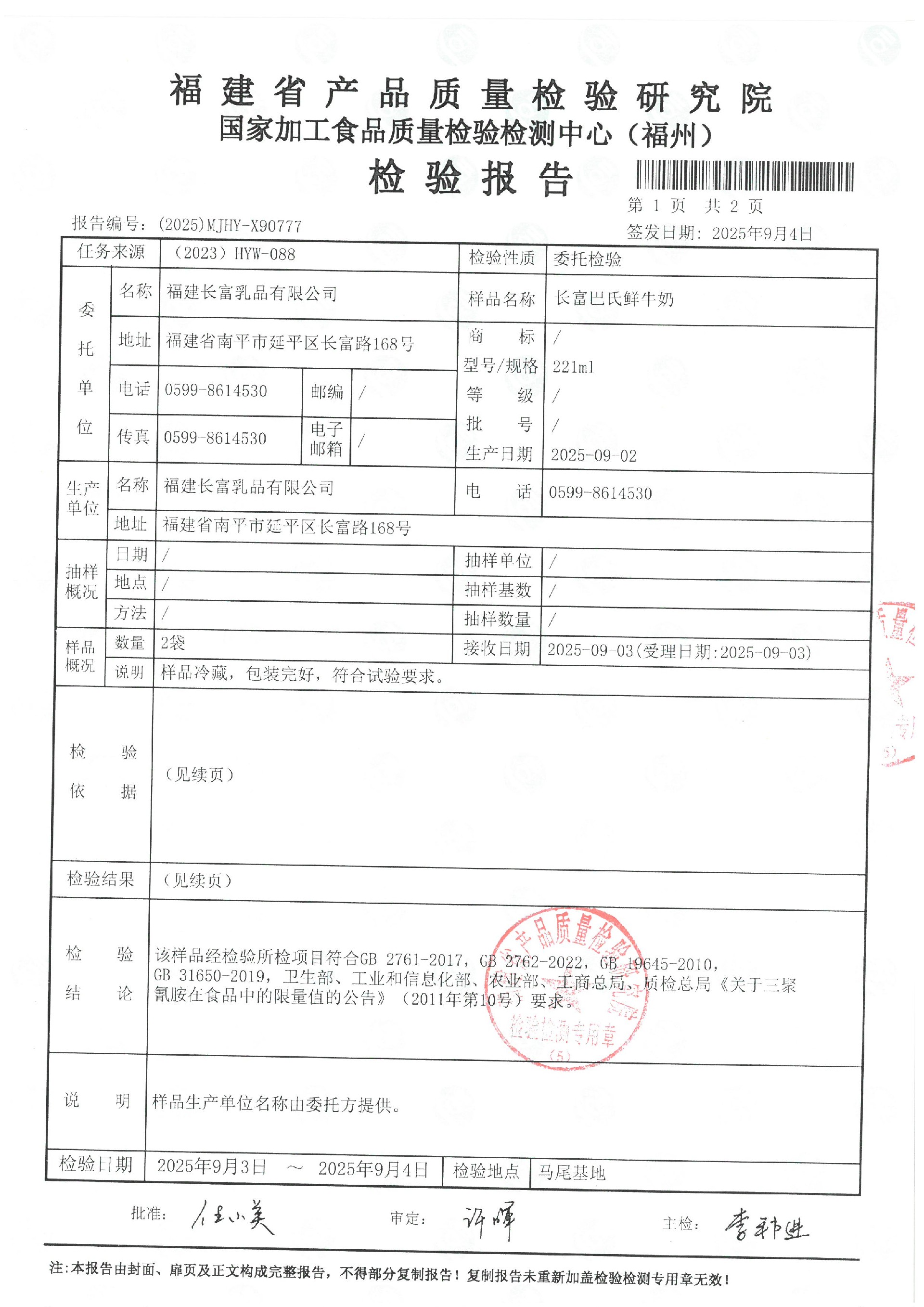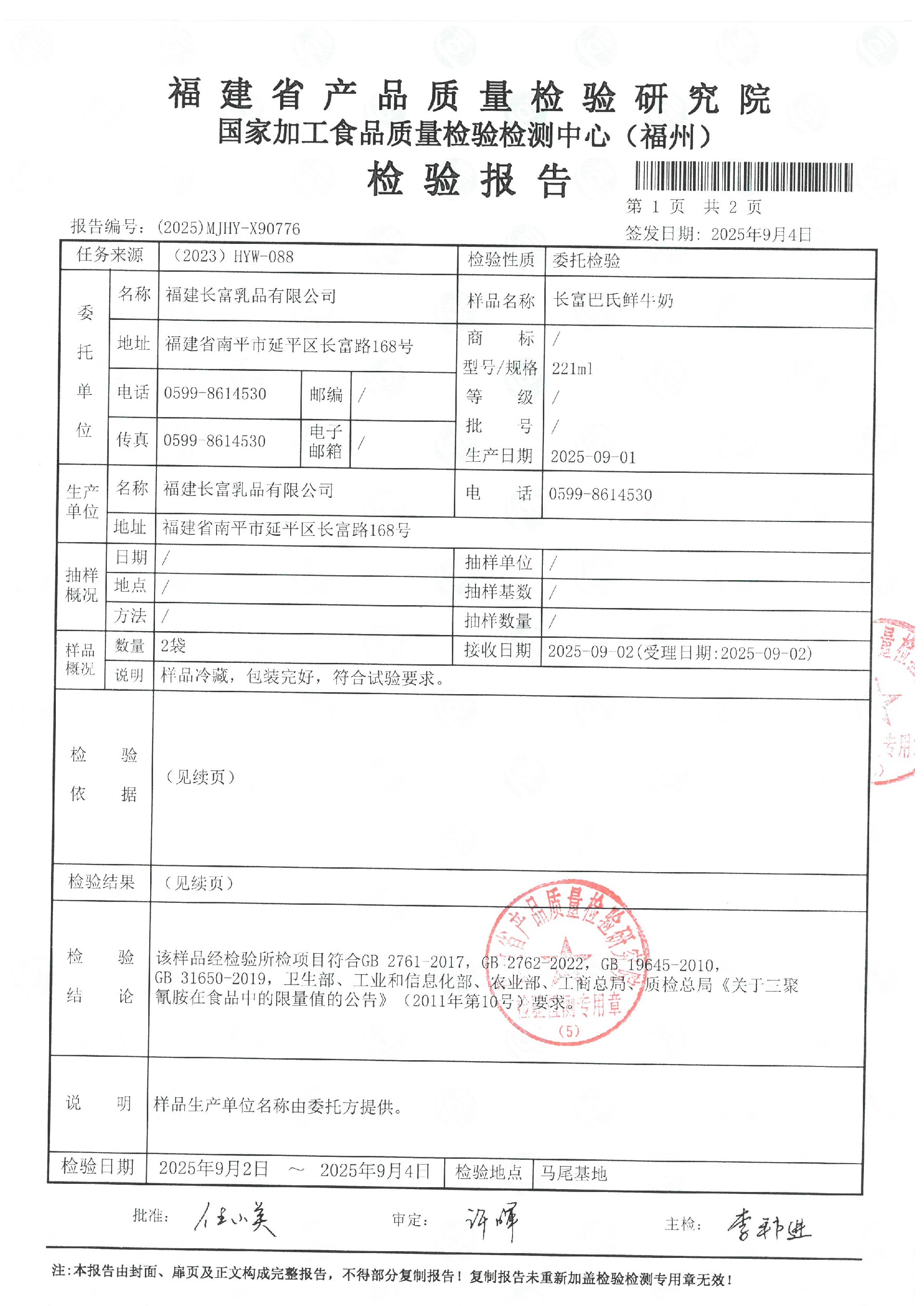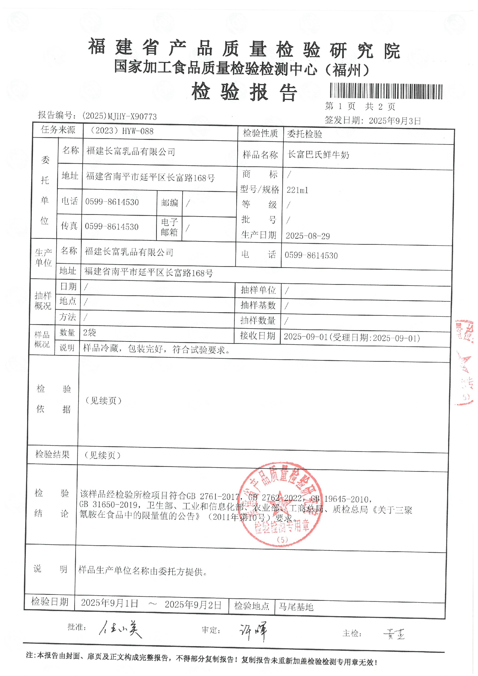 長富牛奶2025年9月2日省質(zhì)檢院冷鏈檢測報(bào)告