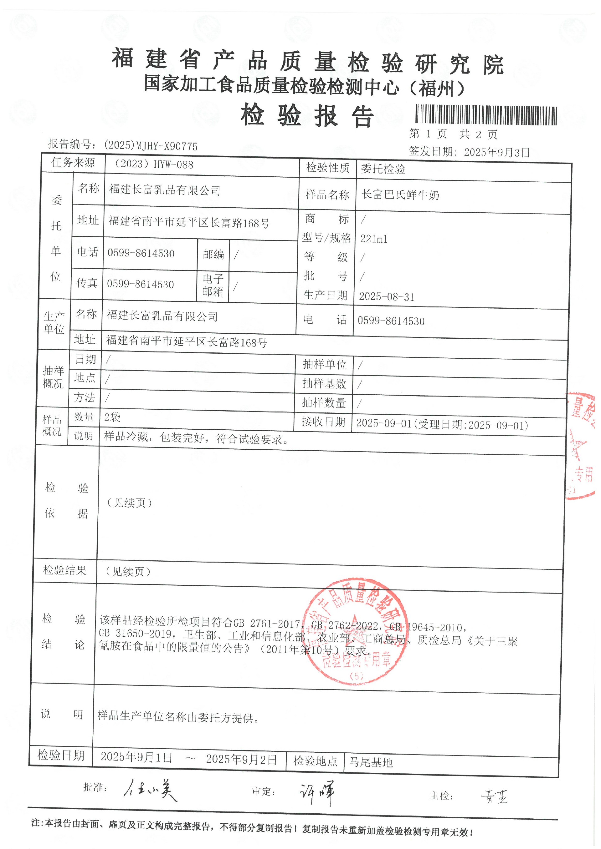 長富牛奶2025年9月1日省質(zhì)檢院冷鏈檢測報(bào)告