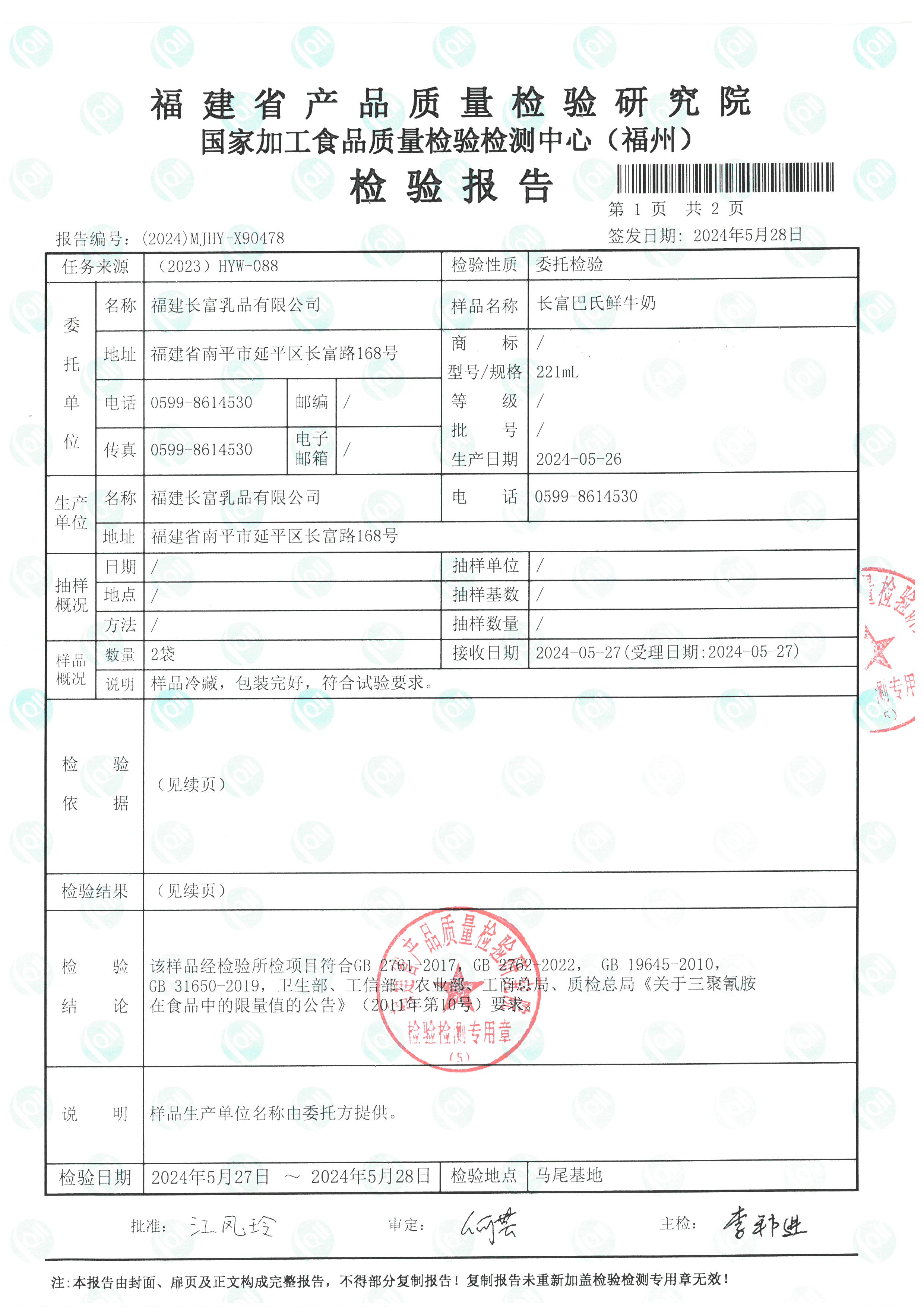 長富牛奶2024年5月26日省質檢院冷鏈檢測報告