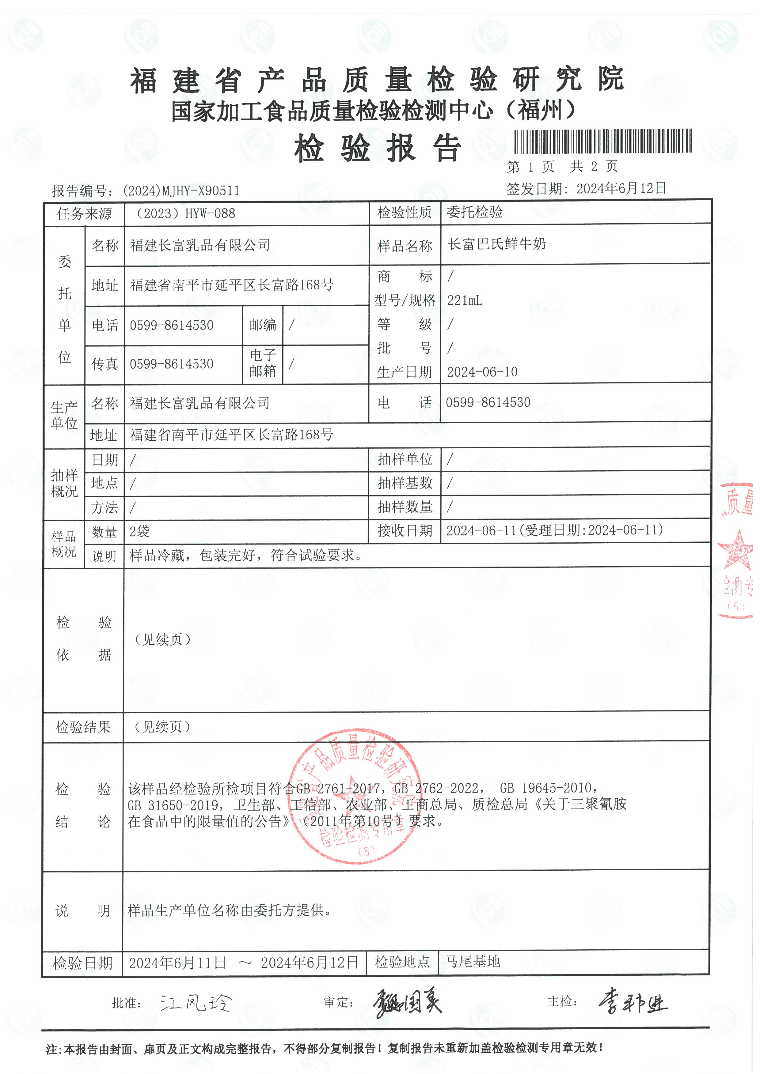 長富牛奶2024年6月10日省質檢院冷鏈檢測報告