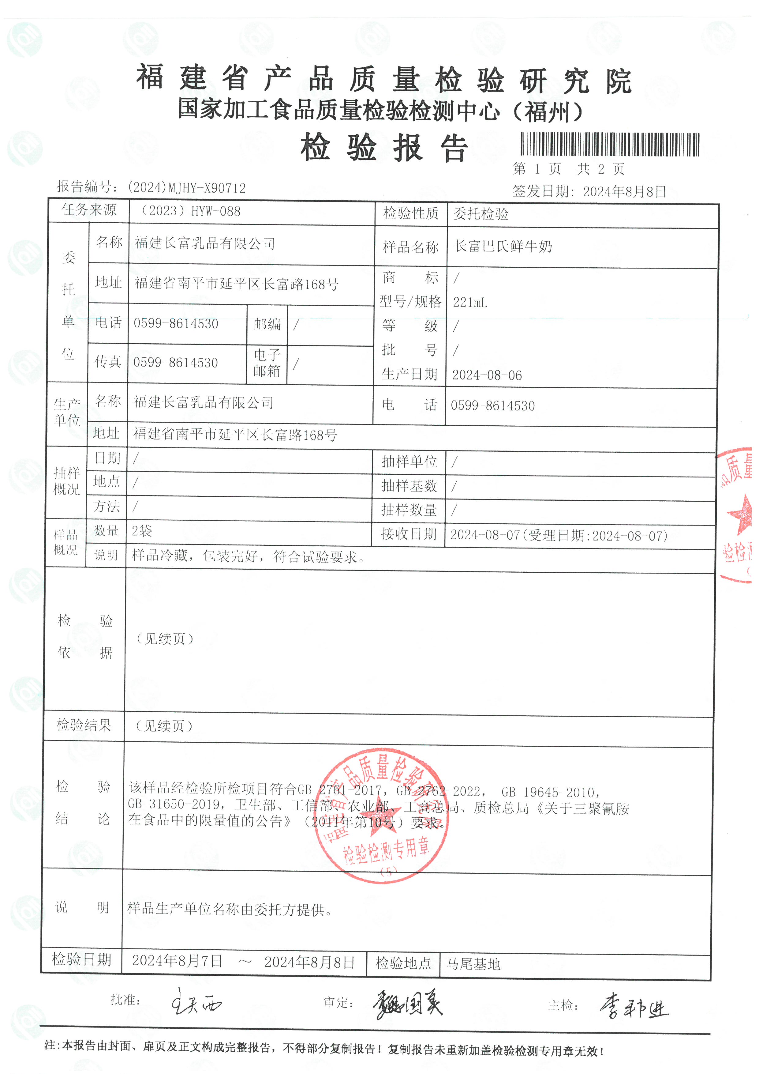 長富牛奶2024年8月6日省質檢院冷鏈檢測報告