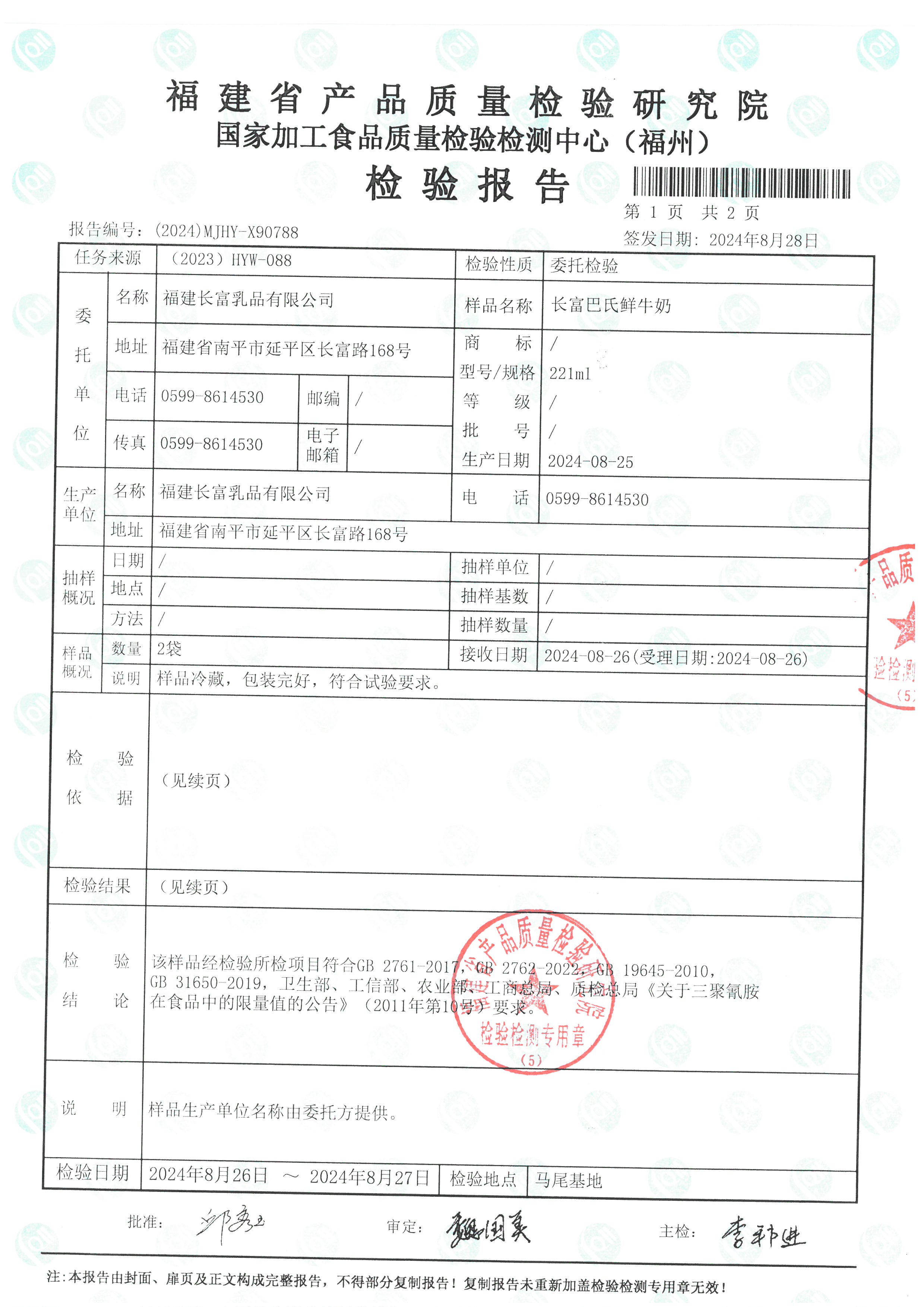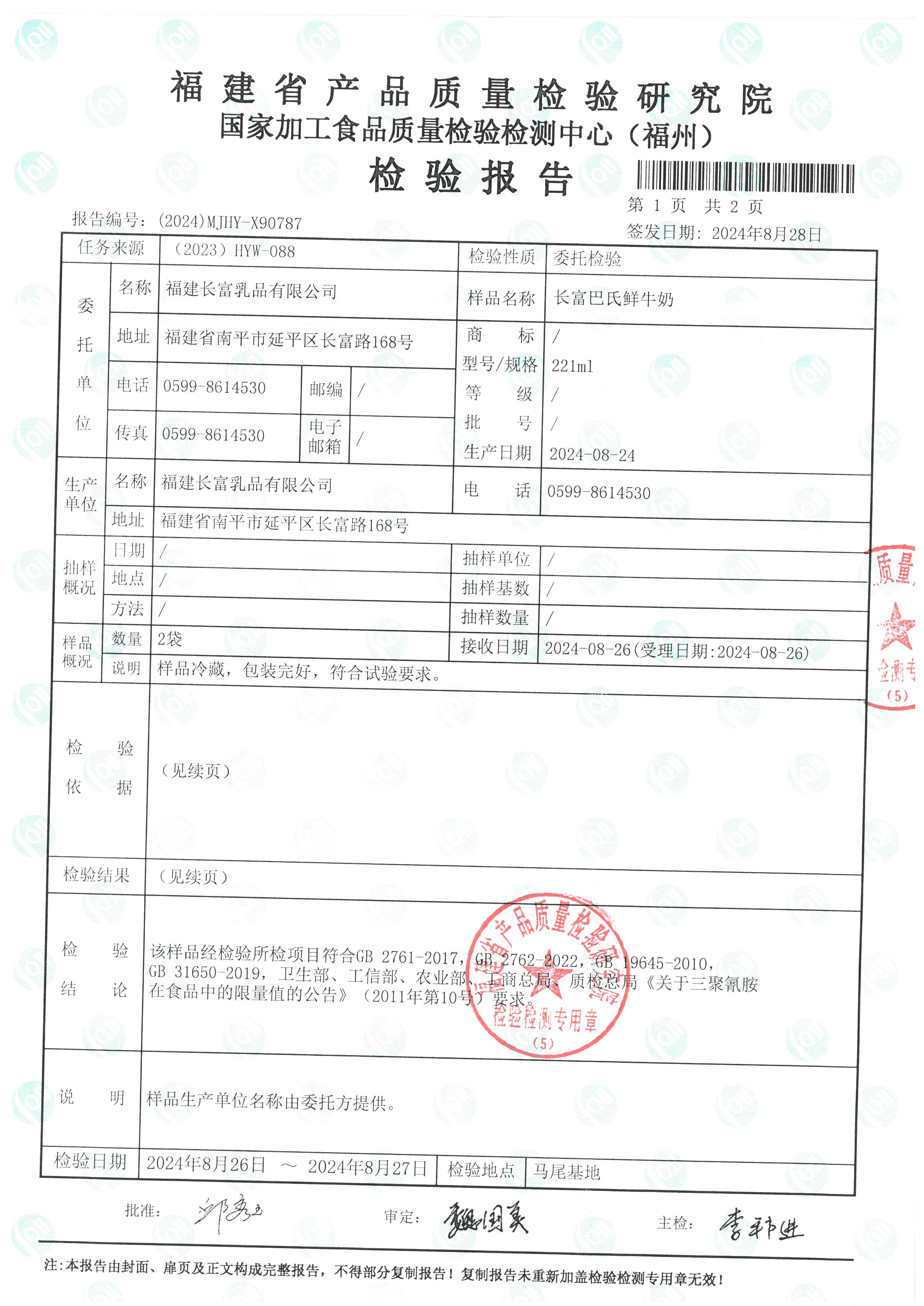 長富牛奶2024年8月24日省質檢院冷鏈檢測報告