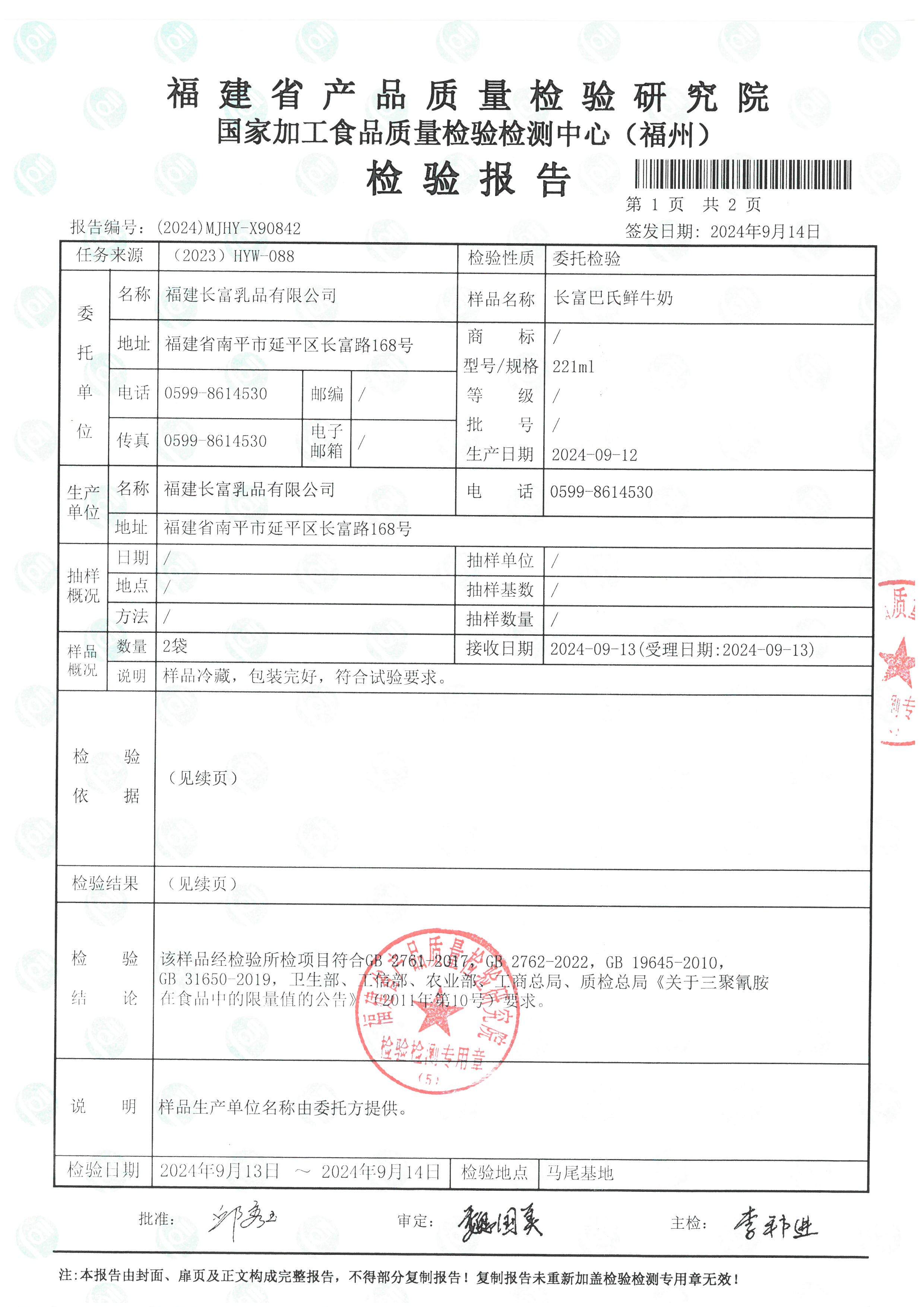 長富牛奶2024年9月2日省質檢院冷鏈檢測報告