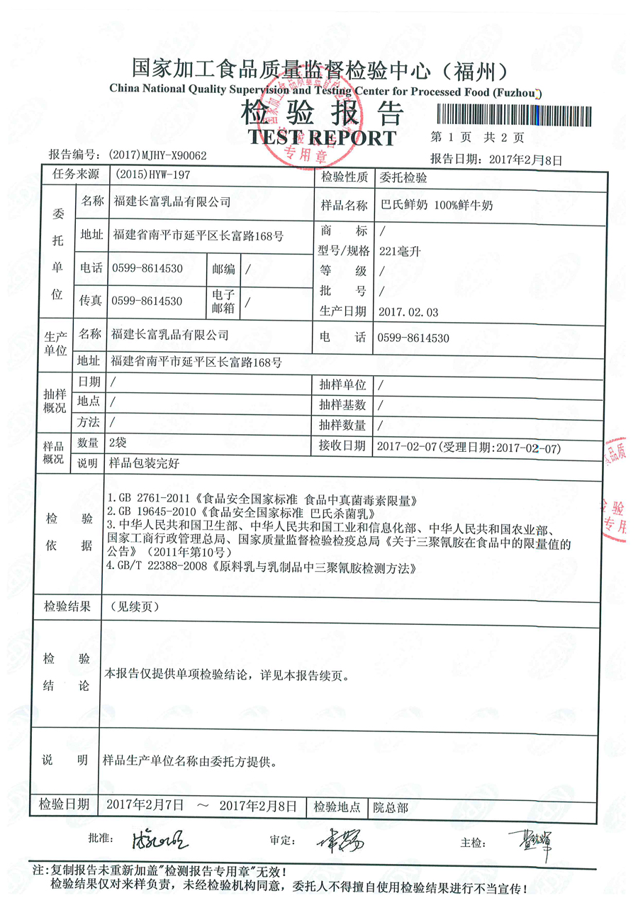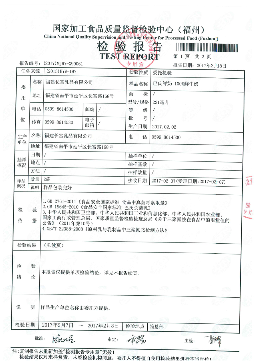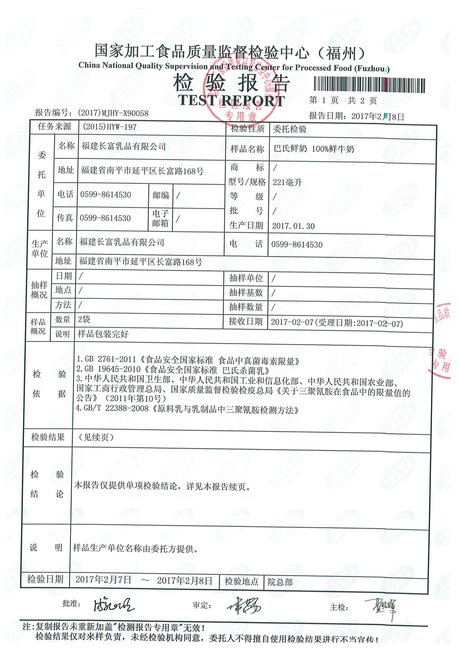 more長富牛奶2017年2月2日質檢所冷鏈檢測報告