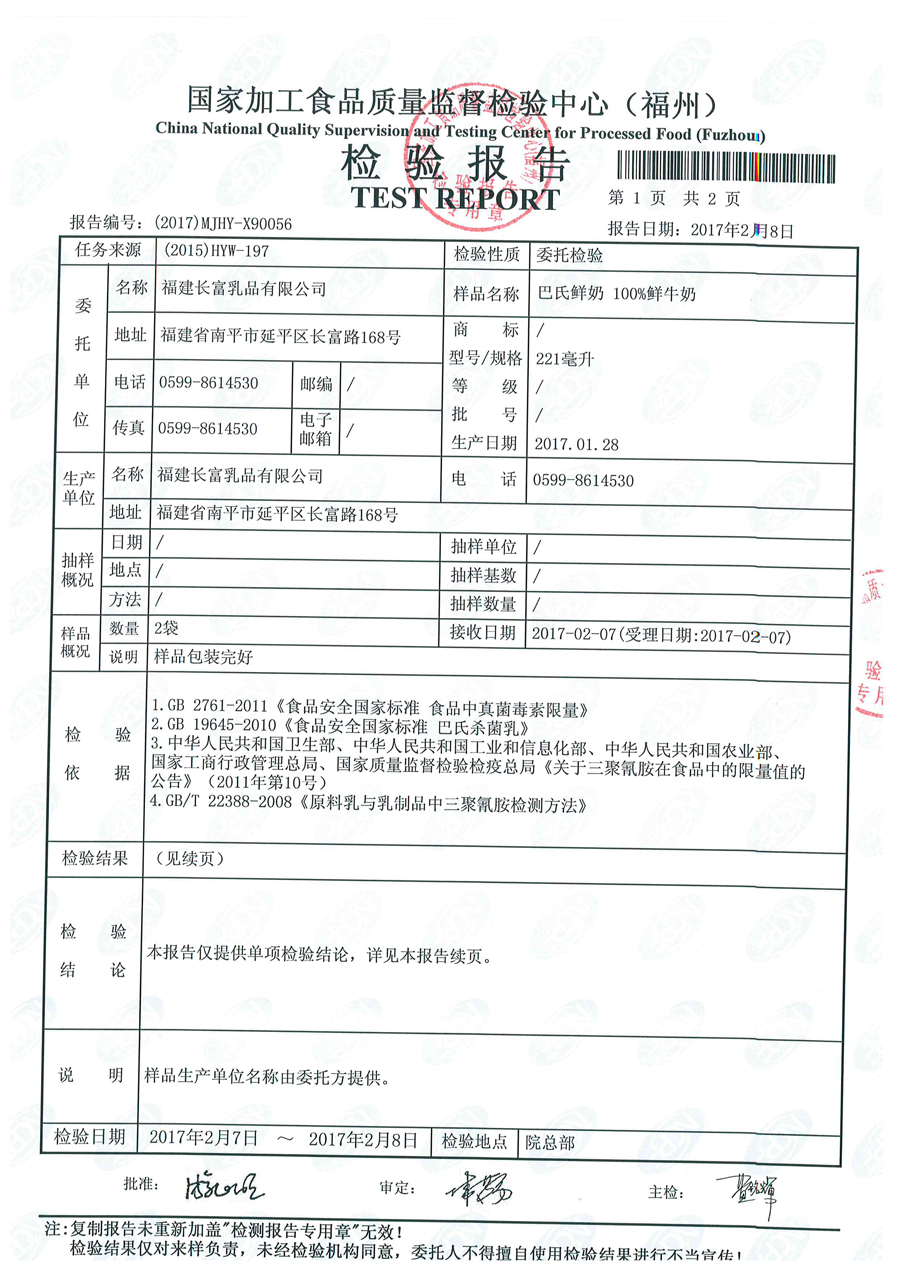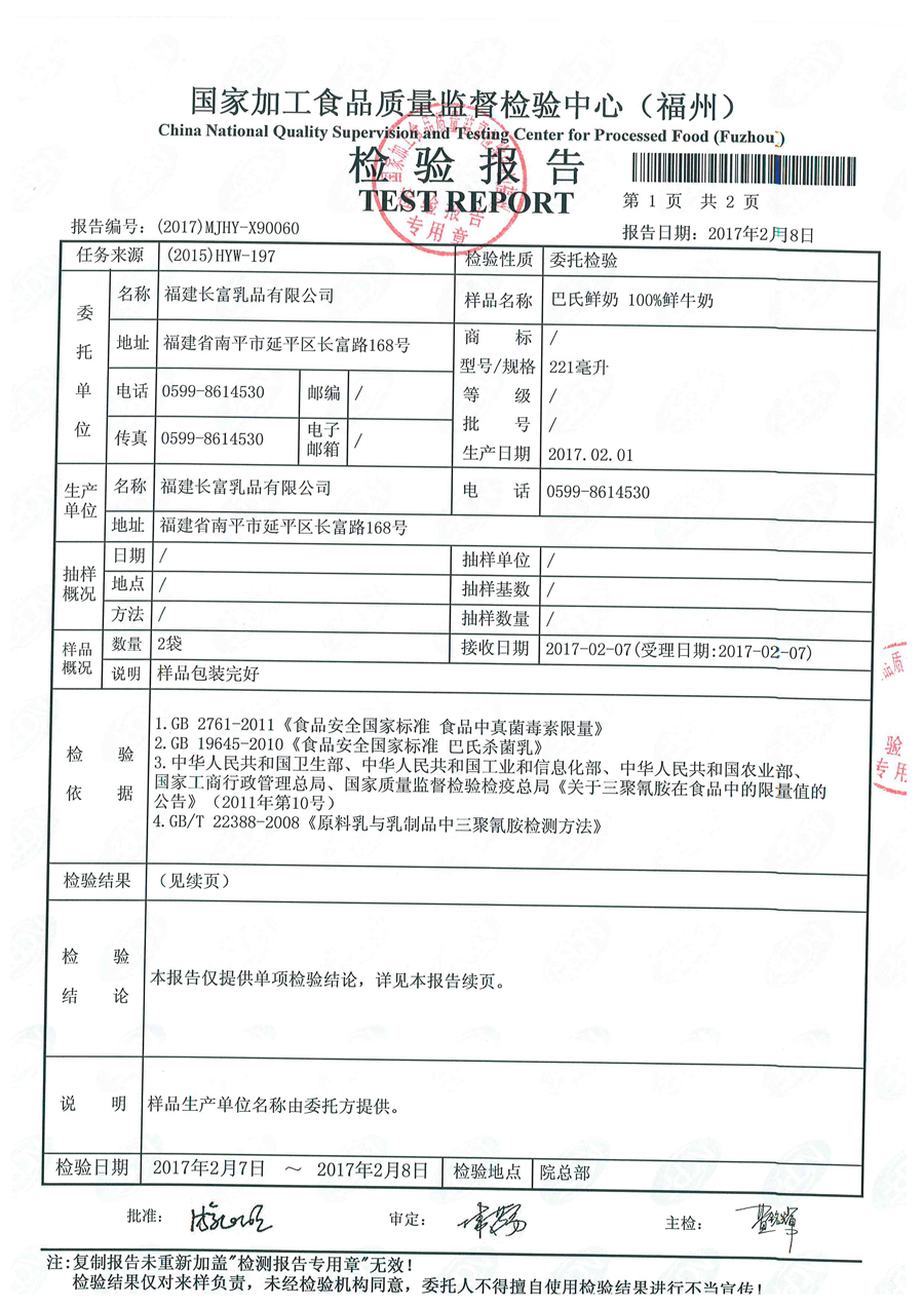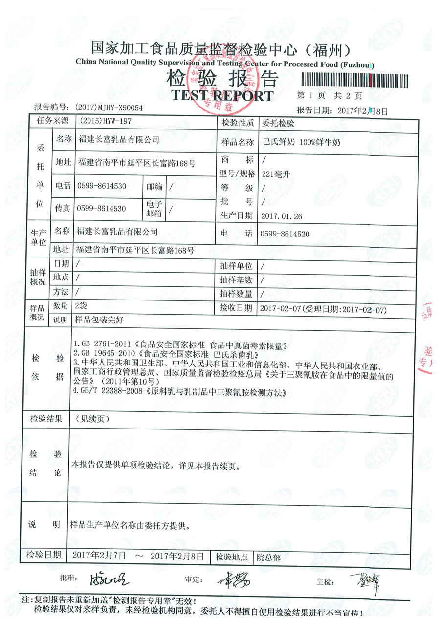 more長富牛奶2017年2月2日質檢所冷鏈檢測報告