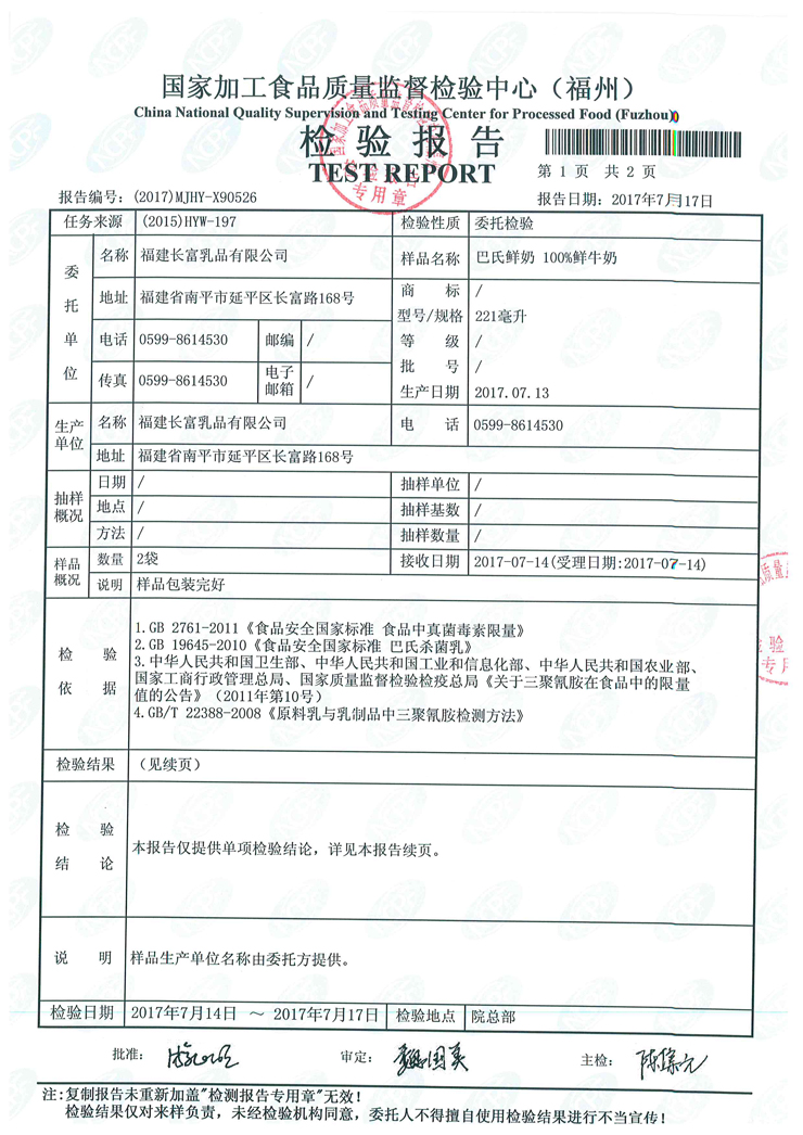 more長富牛奶2017年7月8日質(zhì)檢所冷鏈檢測報告