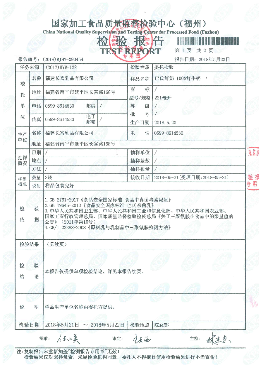 more長富牛奶2018年5月20日質(zhì)檢所冷鏈檢測報告