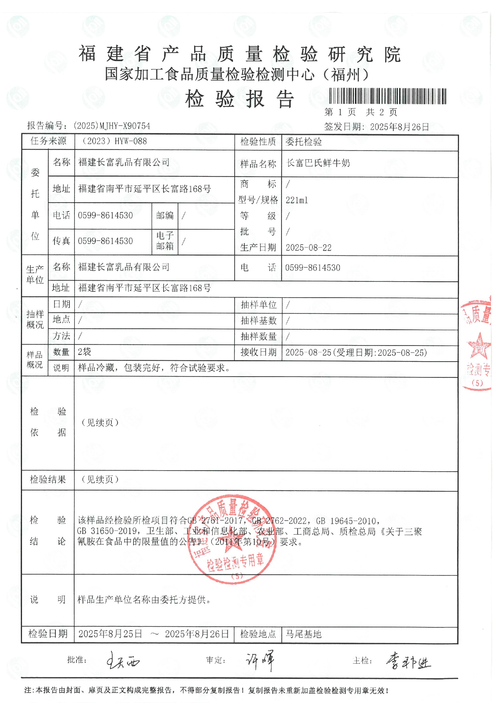 more長富牛奶2025年8月22日省質檢院冷鏈檢測報告