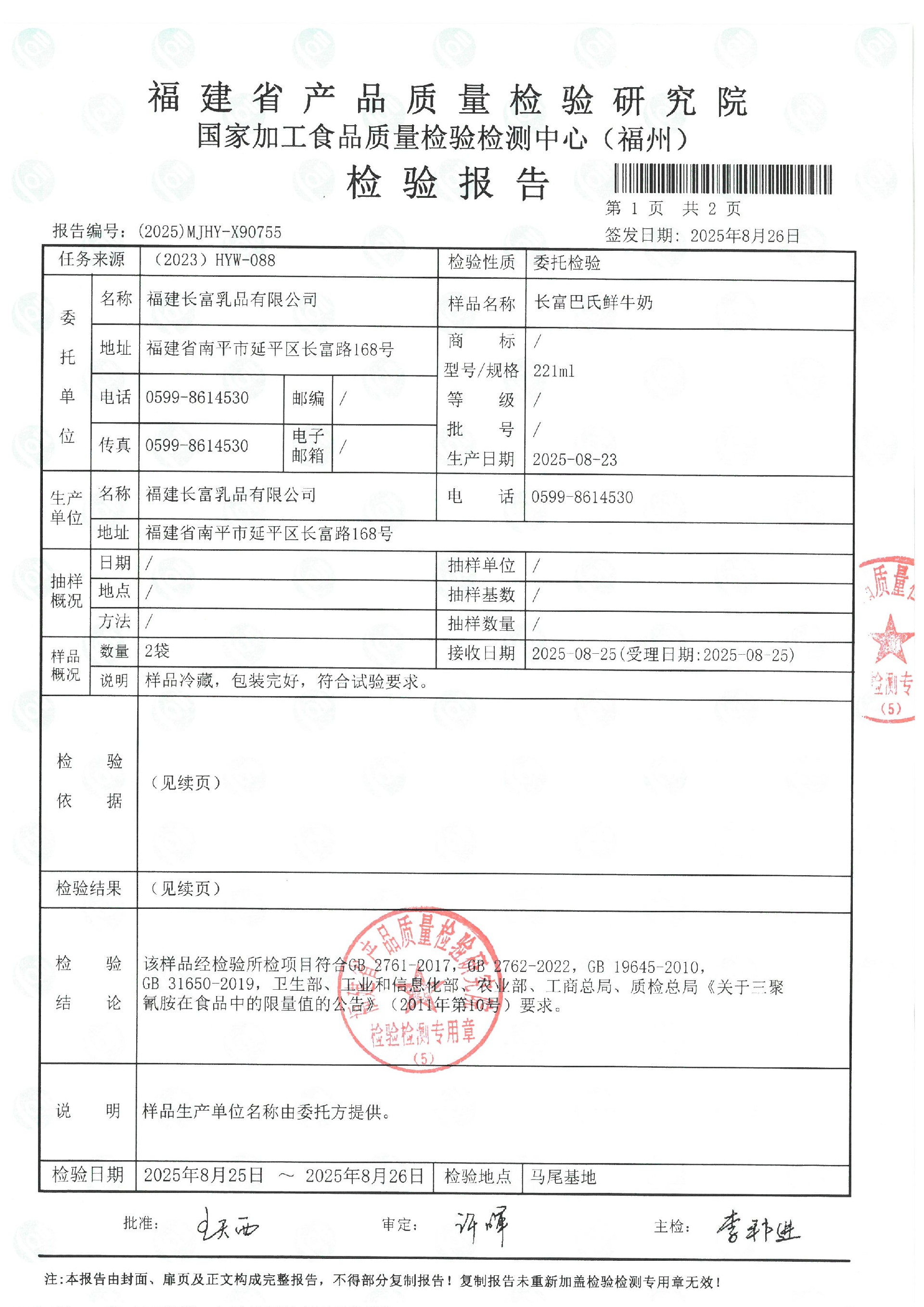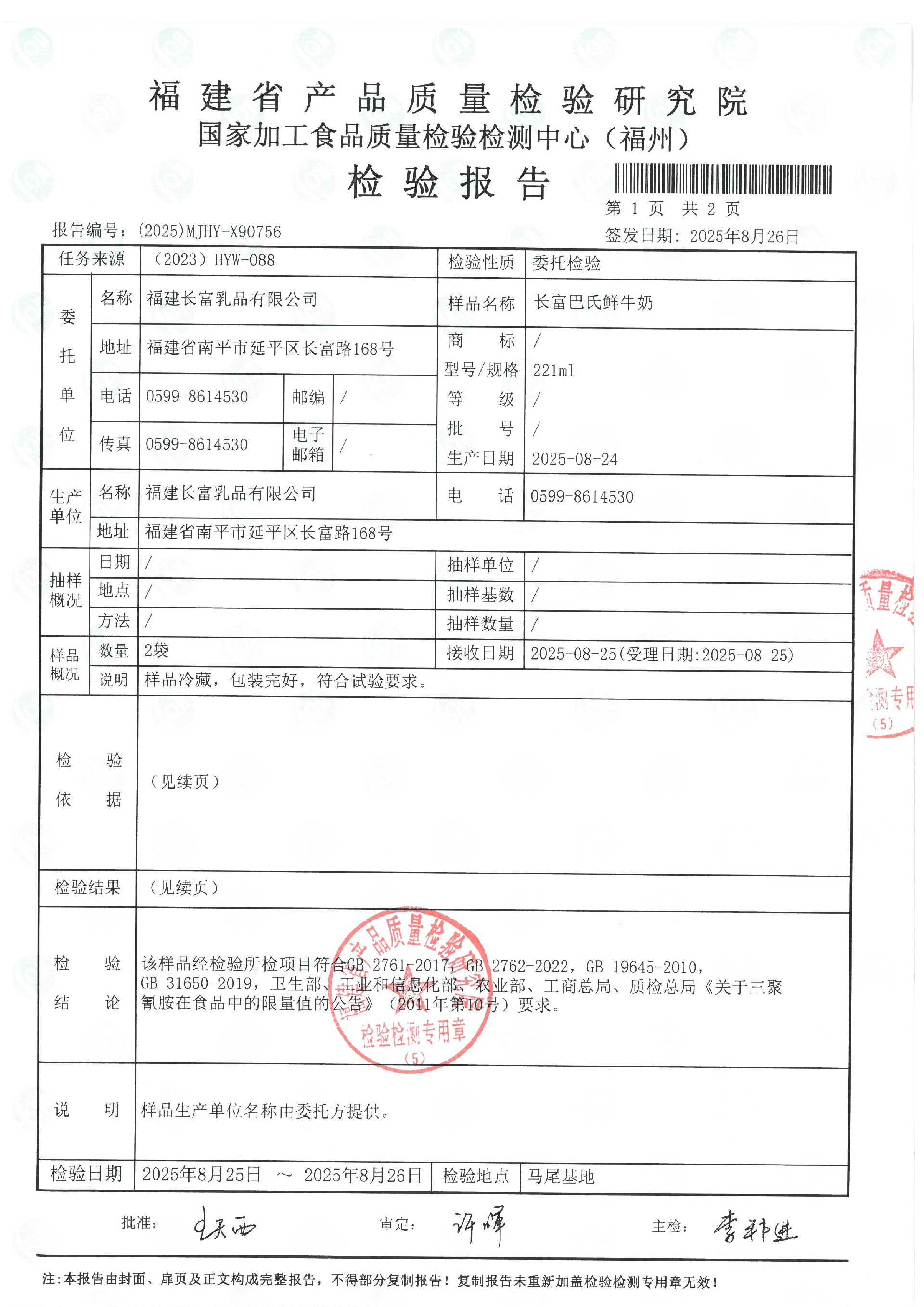 more長富牛奶2025年8月24日省質檢院冷鏈檢測報告